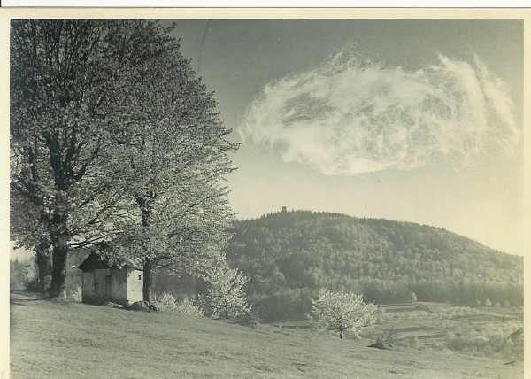 Diese historische Postkarte aus den 40er Jahren des letzten Jahrhunderts zeigt das damalige Kirschenhäuschen auf dem Ellenbacher Hutanger mit Blick zum Arzberg mit dem 1885 erbauten Aussichtsturm.